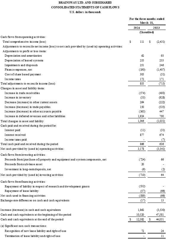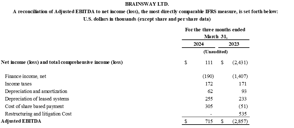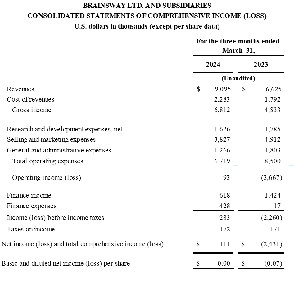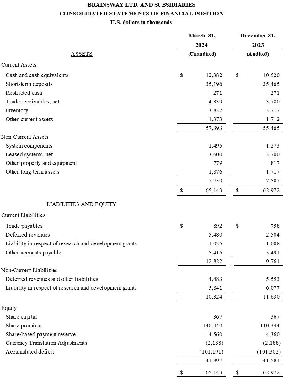 BURLINGTON, Mass. and JERUSALEM, May 8, 2024 (GLOBE NEWSWIRE) — BrainsWay Ltd. (NASDAQ & TASE: BWAY) (“BrainsWay” or the “Company”), a world leader in advanced and non-invasive treatment for brain disorders, today reported first quarter 2024 financial results and provided an operational update.